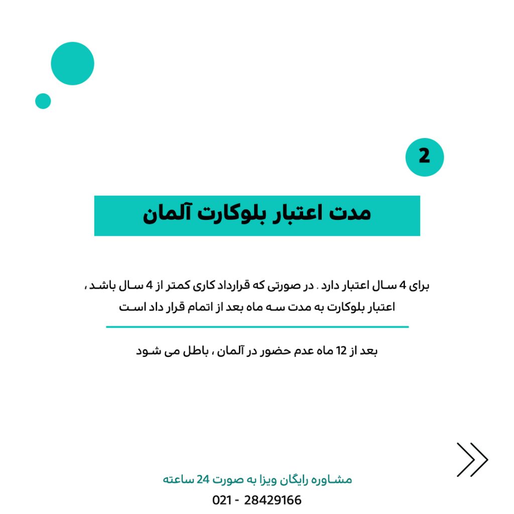 مدت اعتبار این نوع ویزا ۴ سال می باشد البته توجه داشته باشید به نوع کسب و کار هم بستگی دارد و میتواند متغیر هم باشد ویزای بلو کارت مدت زمان بیشتری دارد نسبت به ویزای جستجوی کار ، به ویزای بلو کارت هم معمولا اقامت کارت آبی هم گفته می شود
